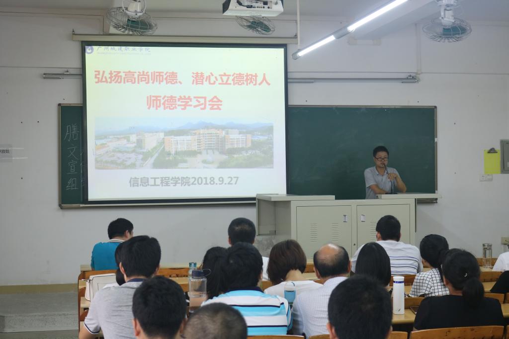 为进一步加强师德建设,切实提高教师师德水平,打造一支师德高尚、素质过硬、技术精良的教师队伍,9月27日下午,信息工程学院在2324召开“弘扬高尚师德、潜心立德树人”师德学习会,全院教职工通过视频认真学习了2016、2017年感动中国十大人物中的教育工作者卢永根、支月英先进事迹。