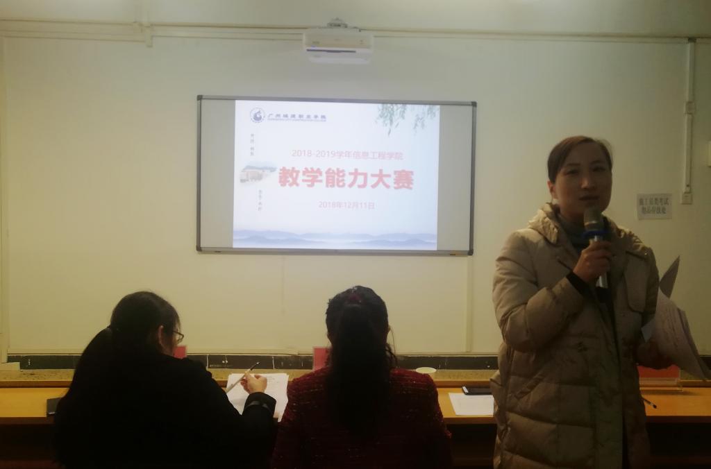为推动信息化教学应用的常态化,提高教师的教学能力和信息素养,加强交流学习,信息工程学院于12月11日在人文艺术楼213智慧教室举行教学能力大赛。比赛邀请教学质量办赵清华教授,教务处副处长唐玉群、人文学院网络与新闻传播教研室主任王婧担任评委。曹春华院长、范新刚副院长、全体专任教师共30余人参与观摩。副院长汤锋主持比赛。