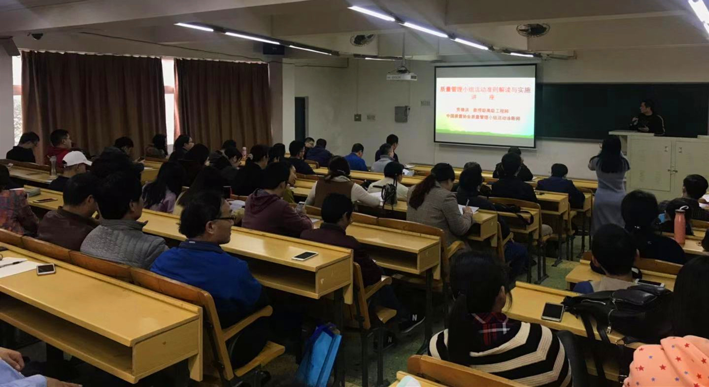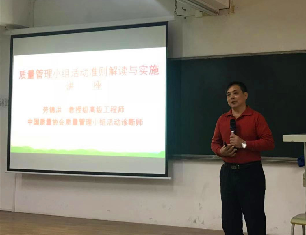 会议伊始,劳锦洪教授通过介绍QC小组活动的历史发展进程、新旧概念的区别、全国QC小组活动纪念大会与成果展示的相关图片,以德国换井盖的视频及其他优秀作品成果展示引出如何实施QC活动小组,并形象地解读了QC小组活动准则。讲座内容丰富,动静结合,为我院全体教职工上了一堂生动活泼的专业知识解读讲座。