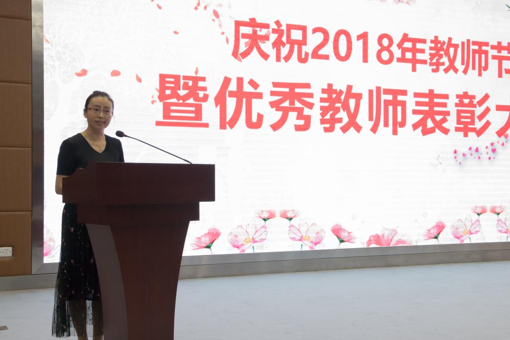 校长蒋新华致辞。他首先代表学校领导班子向全体教职员工致以节日的问候和崇高的敬意。他指出在过去的一年里,学校又涌现了一批先进模范典型,他们来自不同的岗位,有着不同的职责,都在共同为学校快速发展贡献自己的力量。蒋新华还就师德师风建设提出三点希望:一是要恪守“学高为师,身正为范”的为师之道,真正做到把教书育人和自我修养结合起来,做到以德立身、以德立学、以德施教; 二是要关心关爱学生发展,促进学生成长成才; 三是要重视自身修养和素质提升,深刻领悟教育部陈宝生部长近期提出的“教育是道术、学术、技术、艺术、仁术”的内涵实质,争做新时代的“四有”教师。