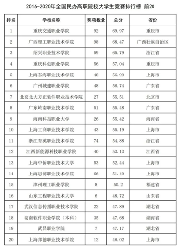 2021年3月22日,中国高等教育学会高校竞赛评估与管理体系研究工作组发布2020全国普通高校大学生竞赛排行榜,其中包含本科院校榜单13个、高职院校榜单10个、省份榜单3个。在“2016-2020年全国民办高职院校大学生竞赛排行榜”中,广州城建职业学院名列全国第六、广东第一。