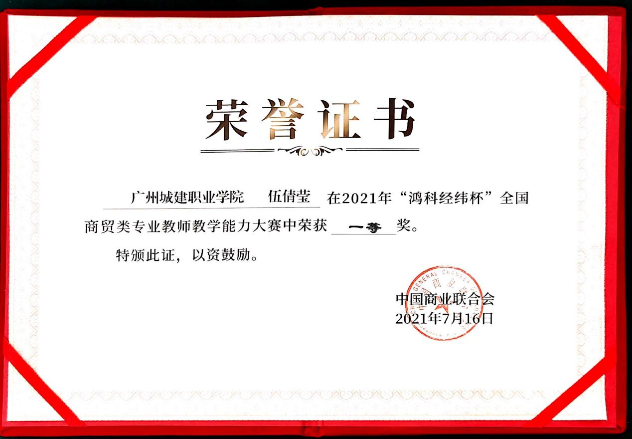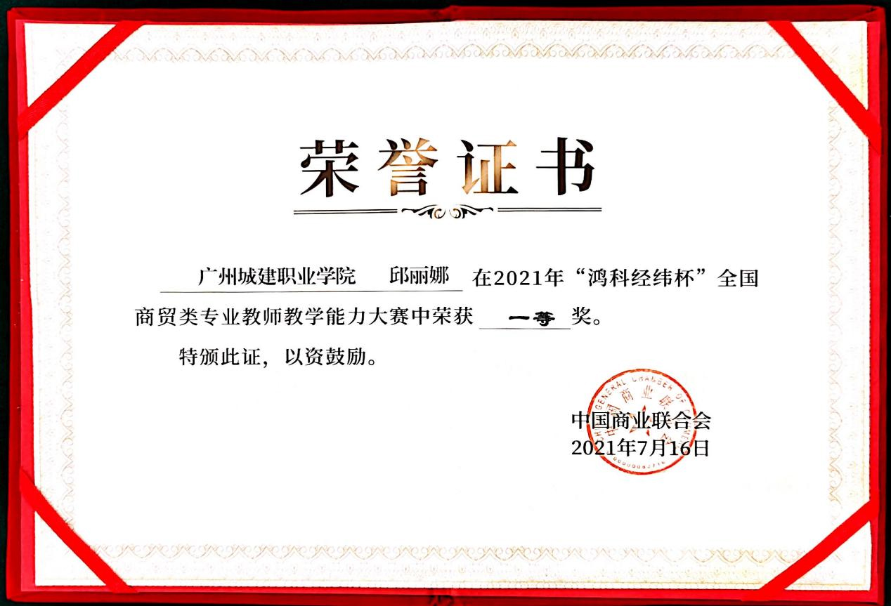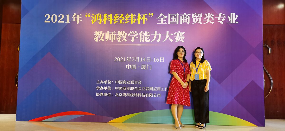 7月14-16日,由中国商业联合会主办、中国商业联合会互联网应用工作委员会承办、北京鸿科经纬科技有限公司协办的2021年“鸿科经纬杯”全国商贸类专业教师教学能力大赛在厦门杏林湾大酒店(中华全国总工会厦门劳动模范疗修养中心)顺利落下帷幕。经过现场比拼,我校电子商务教研室副主任邱丽娜、专任教师伍倩莹均荣获一等奖,各获得3000元奖金。
