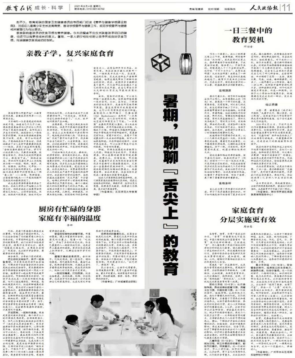 8月4日,人文学院学前教育专业教师李娜撰写的《厨房有忙碌的身影家庭有幸福的温度》文章在《人民政协报》"教育在线”版“成长.科学”栏目署名发表。